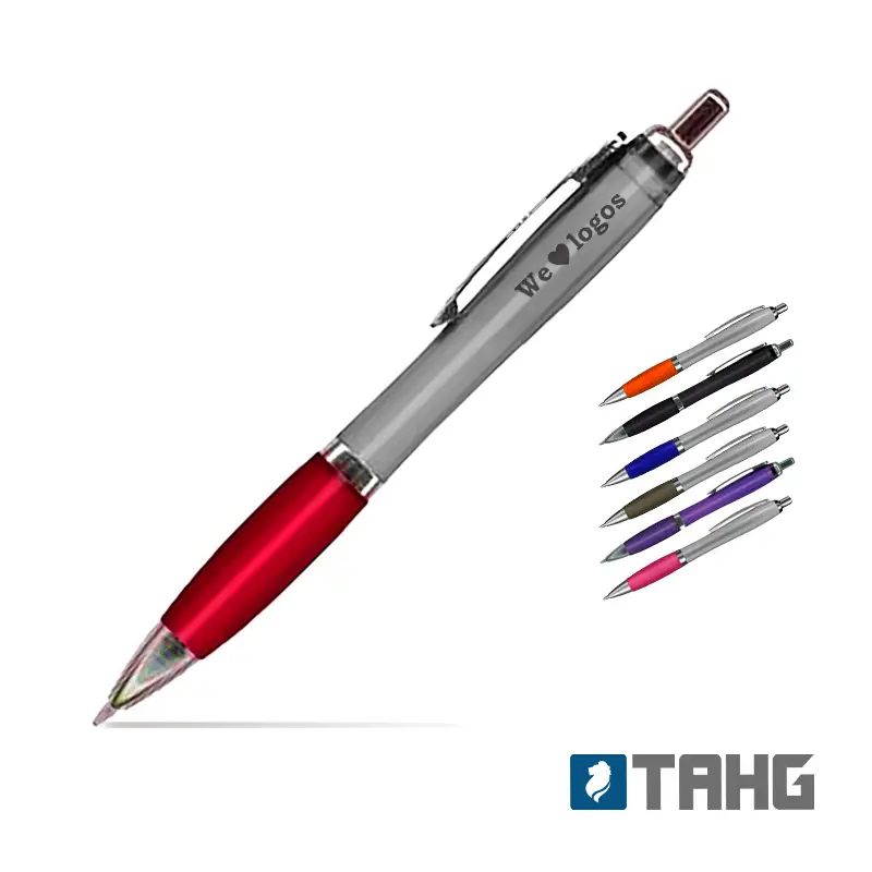 Bolígrafo con cuerpo curvo plástico. Grip de goma de color. Clip, punta y botón de metal. Retráctil. Tinta negra. Producto libre de BPA. Tahg