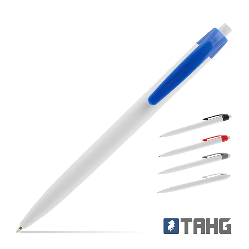 Bolígrafo con cuerpo plástico blanco. Clip de color. Retráctil. Tinta negra. Producto libre de BPA. Tahg
