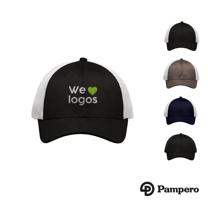 Gorro de 6 paneles de algodón símil gamuza y mesh. Cierre hebilla metálica y tira de símil gamuza. Sticker metalizado en visera. Pampero
