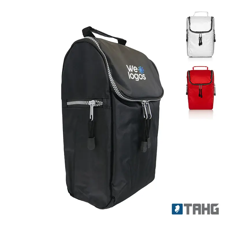 Cooler confeccionado en tela Nylon 600D, interior térmico forrado en PVC gris. Bolsillos laterales. Apto para llevar botellas, termos y otros. Colores: Negro, Blanco, Azul y Rojo. Medidas: 28 alto x 20 ancho x 14 base cm; Capacidad: 8 Lts. Zecat