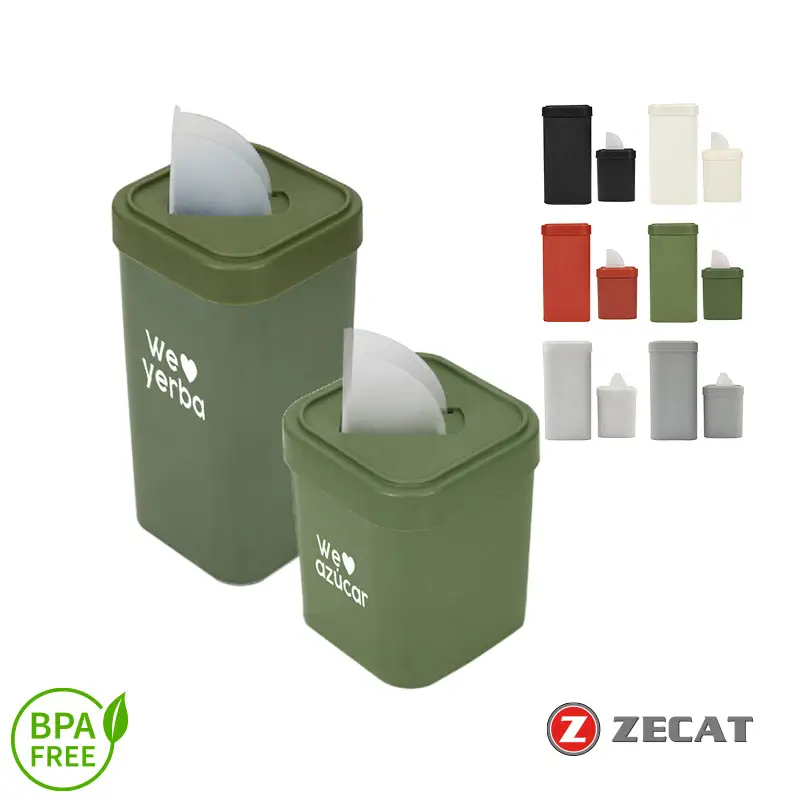Set de yerbera y azucarera con diseño rectangular, hecho en poliestireno con pico vertedor en la tapa. Cuenta con Laterales con terminación texturada y lisa. Medidas: Yerbera: 9 x 17 cm. Azucarera: 9 x 11 cm. Capacidades: Yerbera: 300 grs. Azucarera: 500 grs. Colores: negro, verde militar, marfil y ladrillo. Producto libre de BPA. Zecat