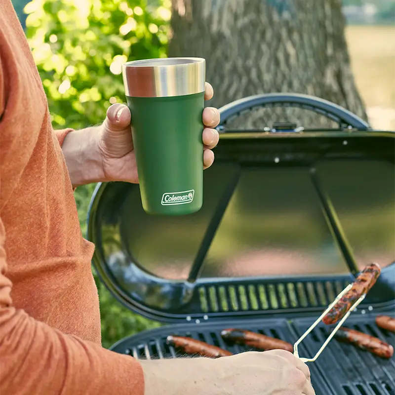 Hombre en la parrilla con Vaso Térmico Coleman Brew Acero Inoxidable 600 Ml - Heritage Red